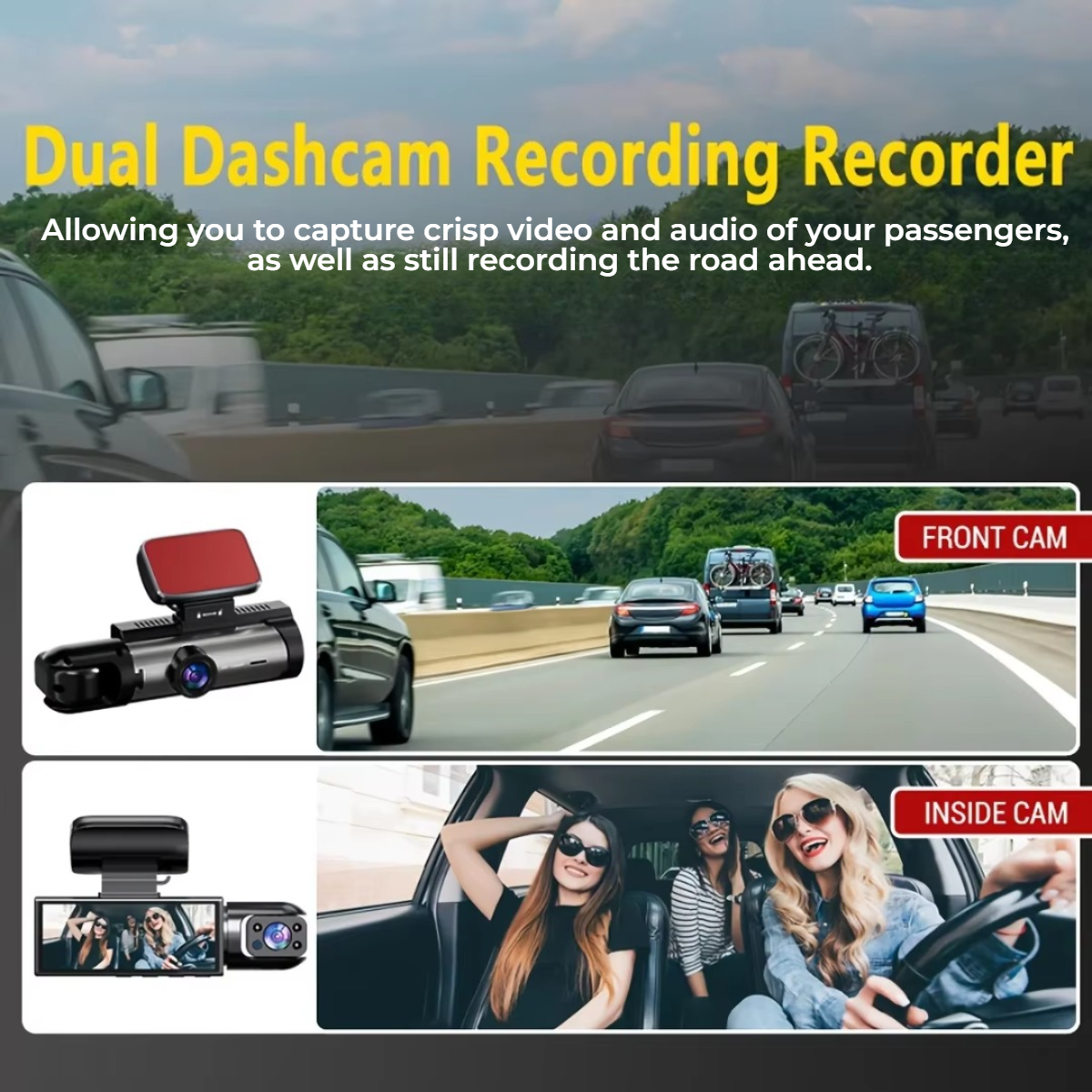 Dual 1080P cameras capture front and rear footage with full clarity